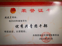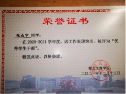 自大二分班,张成宇就参加了班委竞选。竞选团支书成功后他下定决心,一定要尽己所能,服务好班级。担任团支书期间,他积极完成老师布置的各种任务。协助班长更好的开展班内、院内工作,团结同学,积极组织召开主题团日活动,督促班级同学学习青年大学习,积极服务班集体,为班级良好学风的建设贡献自己的力量。在担任班干部期间,张成宇获得了“优秀共青团干部”和“优秀员工干部”的荣誉称号。