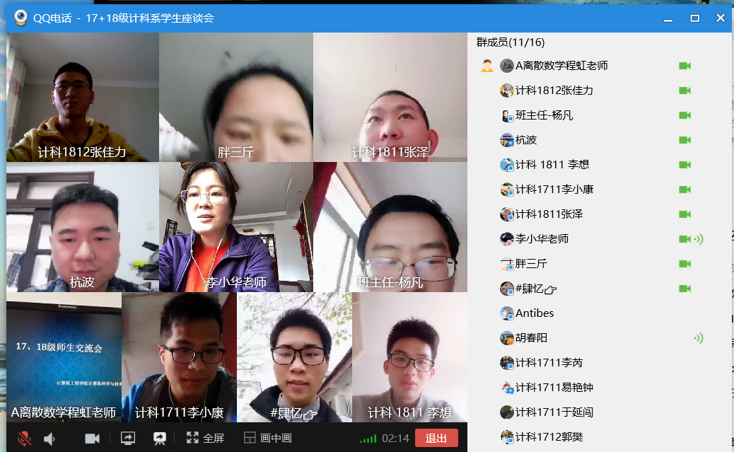 (通讯员 程虹)2020年3月23日下午14:00,计算机科学与技术系在线举行了17、18级毕业生网络座谈会。院长杭波、党委副书记李小华、院长助理张其林,计科系专业负责人胡春阳、党支部书记程虹,17、18级班主任和辅导员以及17、18级的16位员工代表参加了会议,会议由程虹主持。