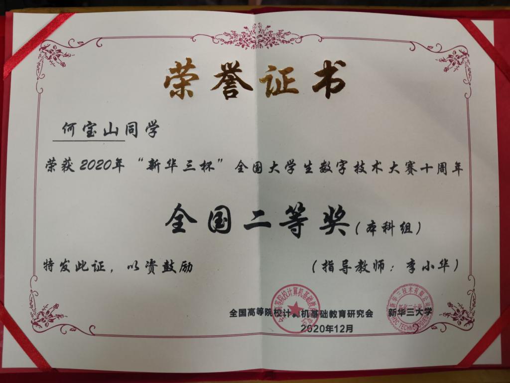 (通讯员 李小华)近日,2020年“新华三杯”全国大员工数字技术大赛落幕。我院多名员工获奖,其中计算机科学与技术2031班员工何宝山获本科组全国二等奖,芮敏博获本科组湖北省一等奖、胡真辉获本科组湖北省二等奖。