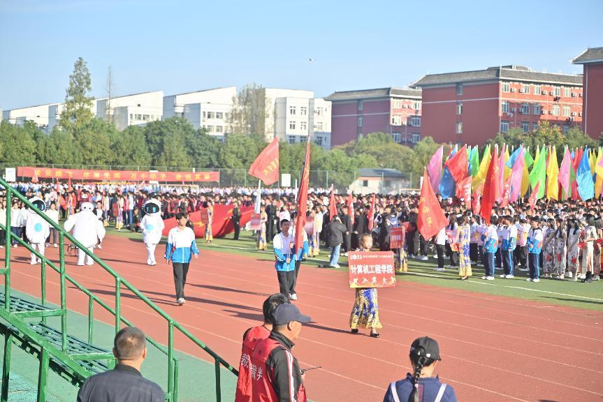 运动会开幕式中,我院教职工方阵和运动员方阵带着饱满的热情依次入场,方阵前率先展示的是我院自主研发的“智能机器狗”,方阵中运动员手持各式各样键盘模型,方阵所过之处引起阵阵欢呼,这充分展示了我院的办学特色和教学实力。