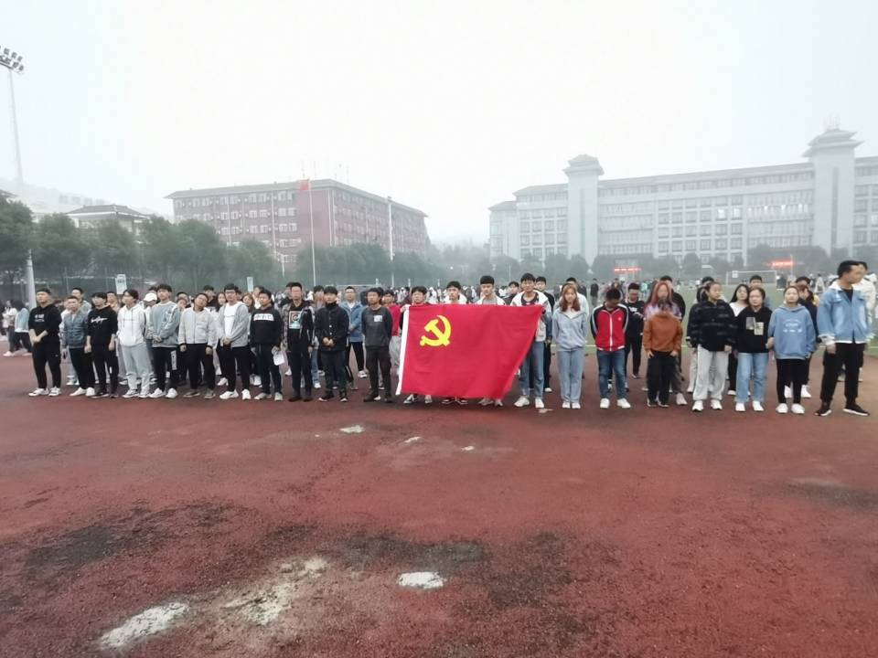 早上7点,同学们准时集合。旗手紧握党旗,同学们紧随其后。天气虽略微阴沉,但阻挡不了同学们前进的步伐。晨跑中,同学们以青春昂扬、积极向上的精神面貌迎接新的一天。